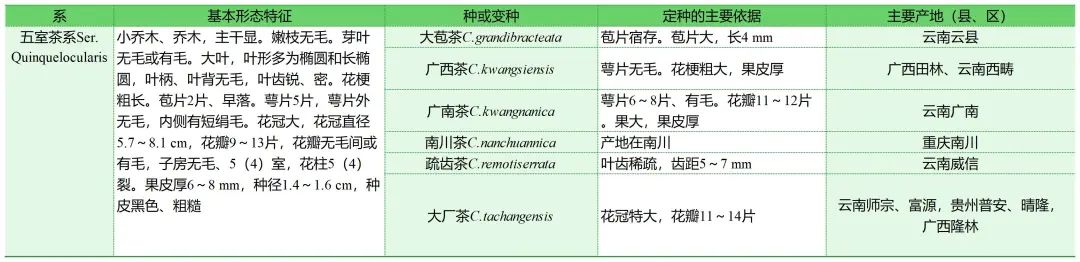 由上图可知,31个种4个变种中,五室茶系6个种,五柱茶系和秃房茶系各7个种,茶系11个种4个变种,可见变种都出现在茶系。