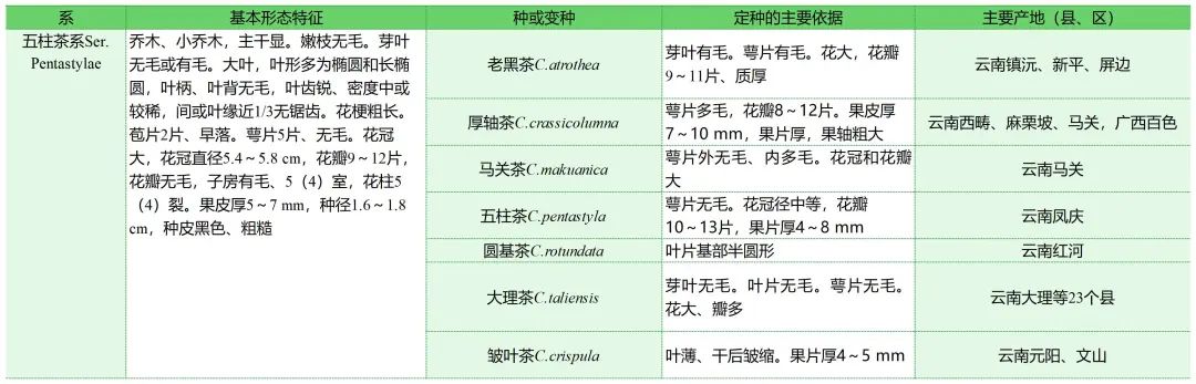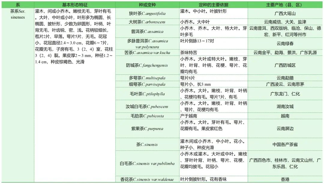 4个系是按性状的分化程度而划分的,野生型茶树多属于五室茶系和五柱茶系,如分布在云南、贵州、广西3省区接壤处的大厂茶(C.tachangensis),分布在云南东南部和广西西部的厚轴茶(C. crassicolumna),云南西南部和西部的大理茶(C. taliensis),哀牢山一带的老黑茶(C. atrothea)等。栽培型茶树多属于茶系,少数是秃房茶系,如全国广泛栽培的灌木中小叶茶树属于茶(C. sinensis);俗称的“云南大叶种”属阿萨姆茶(C. assamica);枝叶花满披白毛,分布在云南东部、广西、广东北部、湖南南部等地的属于白毛茶(C. sinensis var. pubilimba);花柱3裂、子房秃净,生长在云南东北部、贵州西北部、重庆、四川东南部和西部等地的属于秃房茶(C. gymnogyna)。