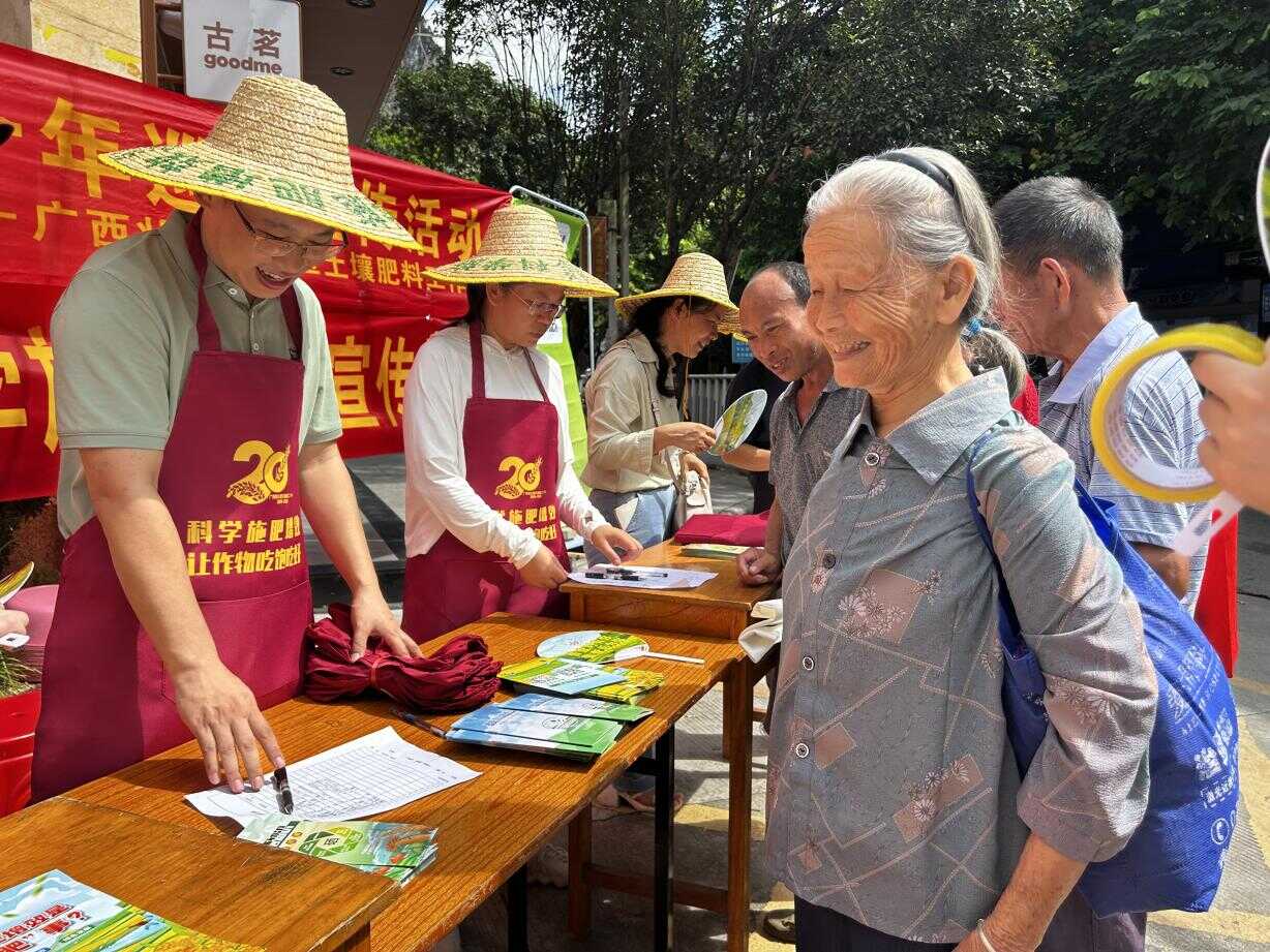 “老乡,我们通过给土地‘体检建档’,再给出施肥建议配方,养分缺什么补什么,缺多少补多少,使作物‘吃饱不浪费’!”在钦州市灵山县活动现场,农技专家向围拢过来观看宣传片的村民们讲解道。