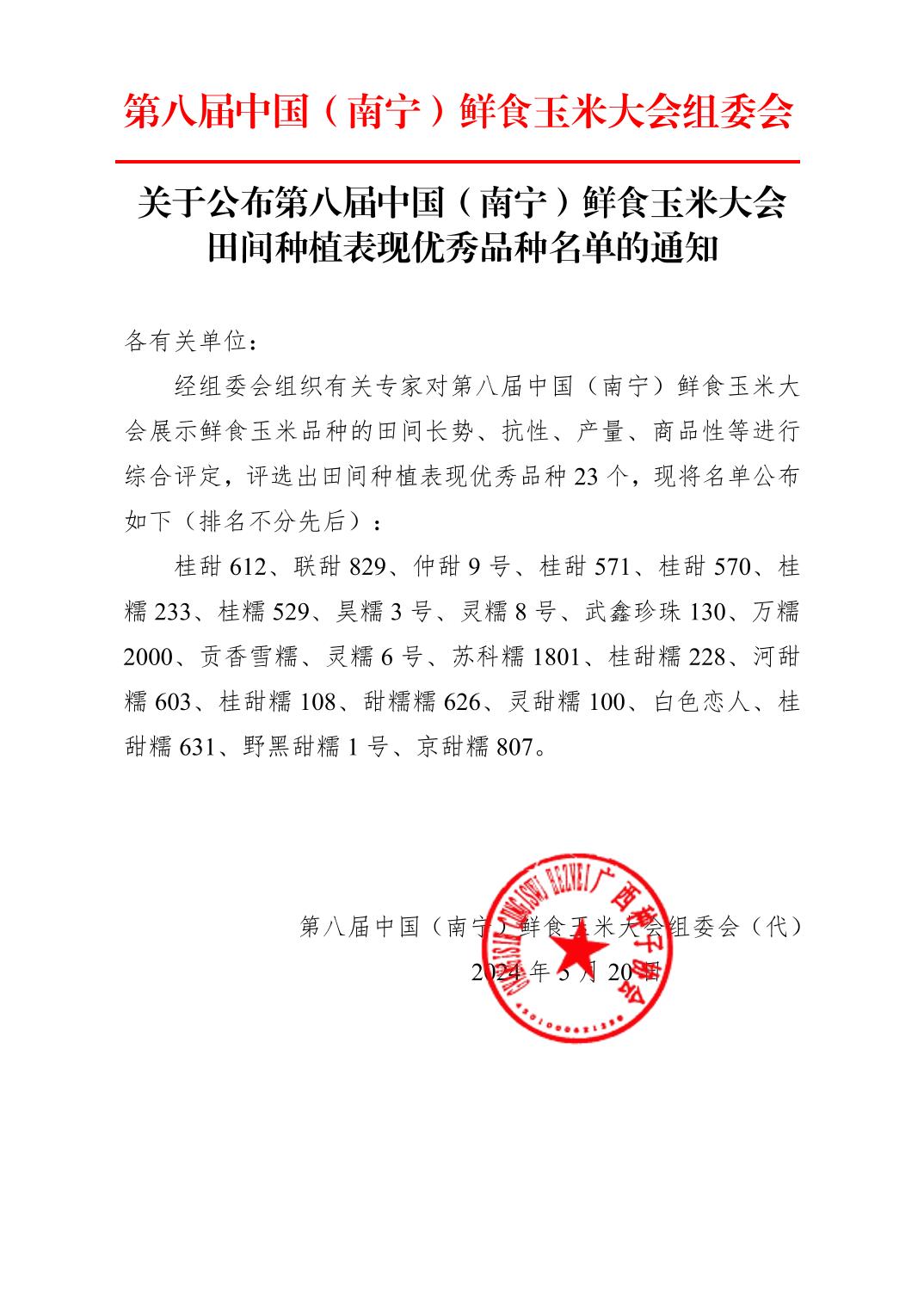 关于公布第八届中国(南宁)鲜食玉米大会田间种植表现优秀品种名单的通知