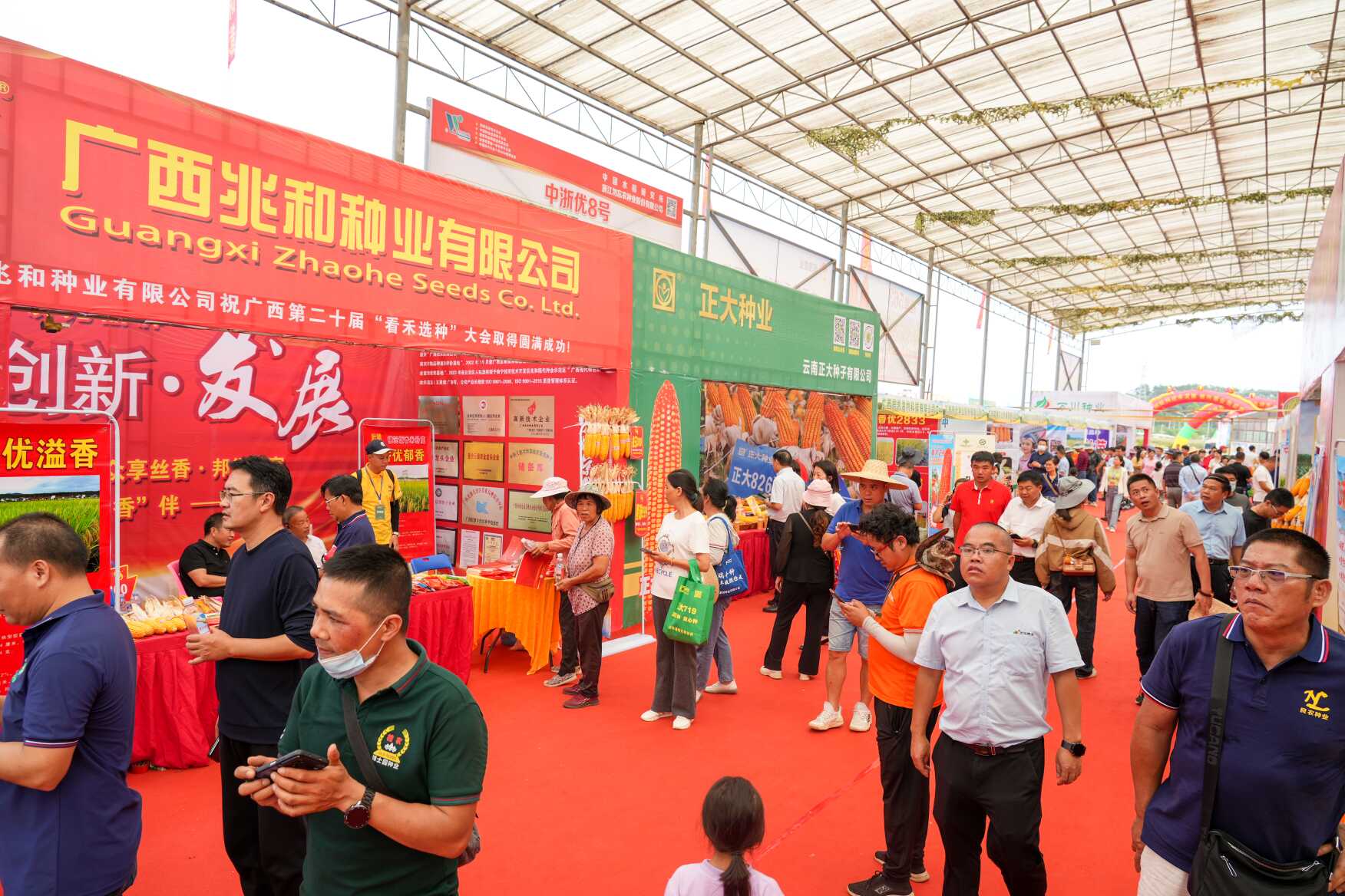 第二十届广西“看禾选种”大会、第六届中国(南宁)鲜食玉米大会开园仪式在广西南宁五塘镇国家农作物展示评价基地举行。大会设有水稻、玉米、大豆品种展示区,吸引了110家单位参展。其中,水稻品种展示区分为企业专区、广西好稻米展示评选区、新审定品种区、苗头品种测试区、节水抗旱稻展示区、广西水稻品种生产试验区、国家华南晚籼组生产试验区等,展示新品种481个;大豆和玉米品种展示区,分为企业专区、鲜食玉米专区、审定品种区、苗头品种测试区、大豆玉米带状种植展示区等,展示普通玉米品种200个,大豆品种6个。第六届中国(南宁)鲜食玉米大会展示鲜食玉米品种83个。