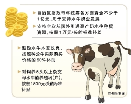 各市、县要积极筹措资金支持本地水牛奶业发展。自治区财政每年统筹各方面资金不少于1亿元,用于支持广西水牛奶业发展。