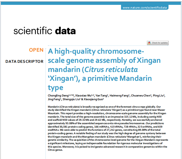 近日,我院柑橘种质创新与利用团队邓崇岭研究员课题组在二区期刊《Scientific Data》(IF2024=6.9)发表题为“A high-quality chromosome-scale genome assembly of Xingan mandarin (Citrus reticulata ‘Xingan’), a primitive Mandarin type”的研究论文。