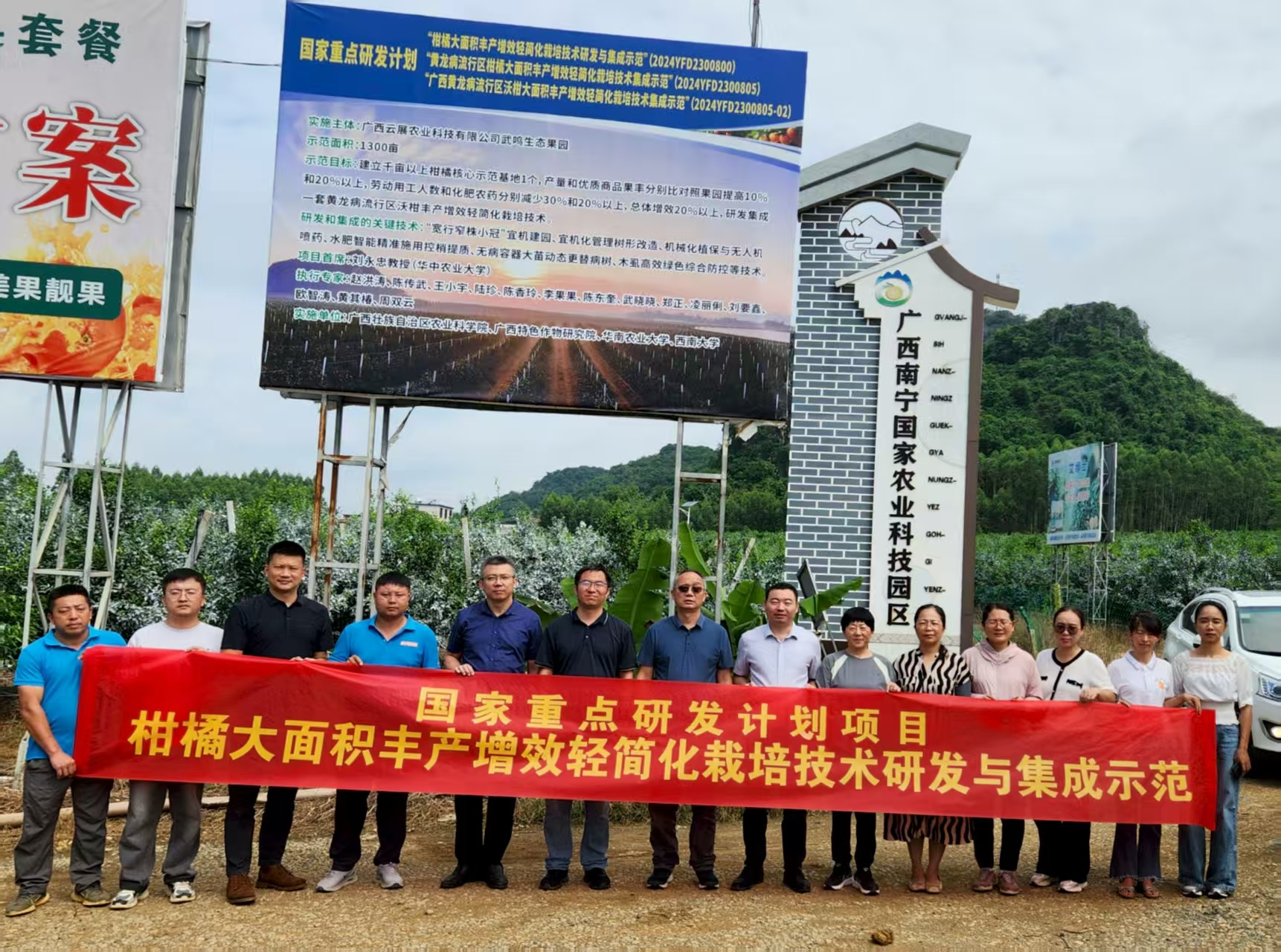 2025年8月7-10日,国家重点研发计划“柑橘大面积丰产增效轻简化栽培技术研发与集成示范”项目首席科学家、华中农业大学刘永忠教授、课题负责人及课题组成员一行赴广西、广东对黄龙病流行区柑橘大面积丰产增效轻简化栽培技术集成示范基地进行考察和调研。