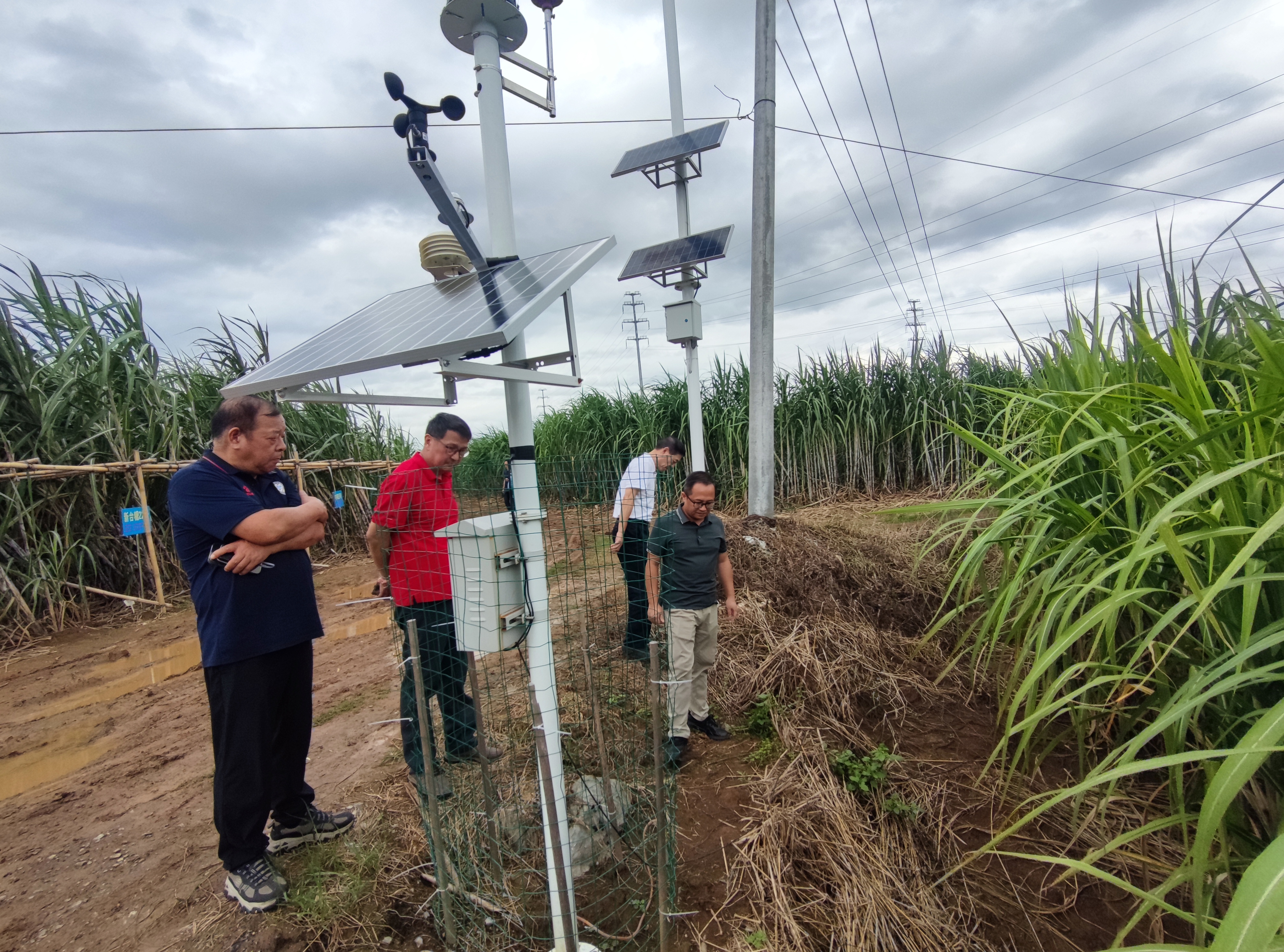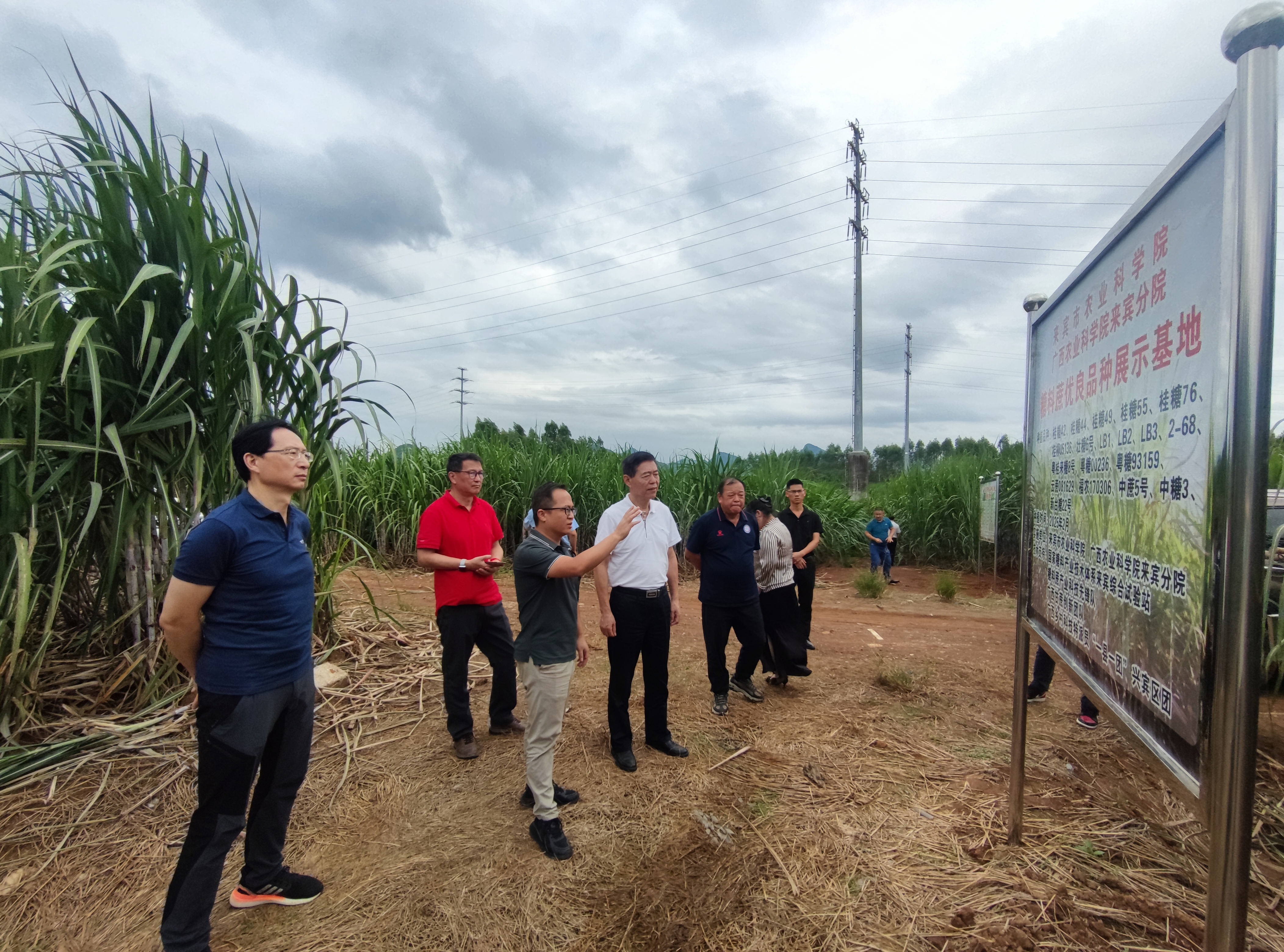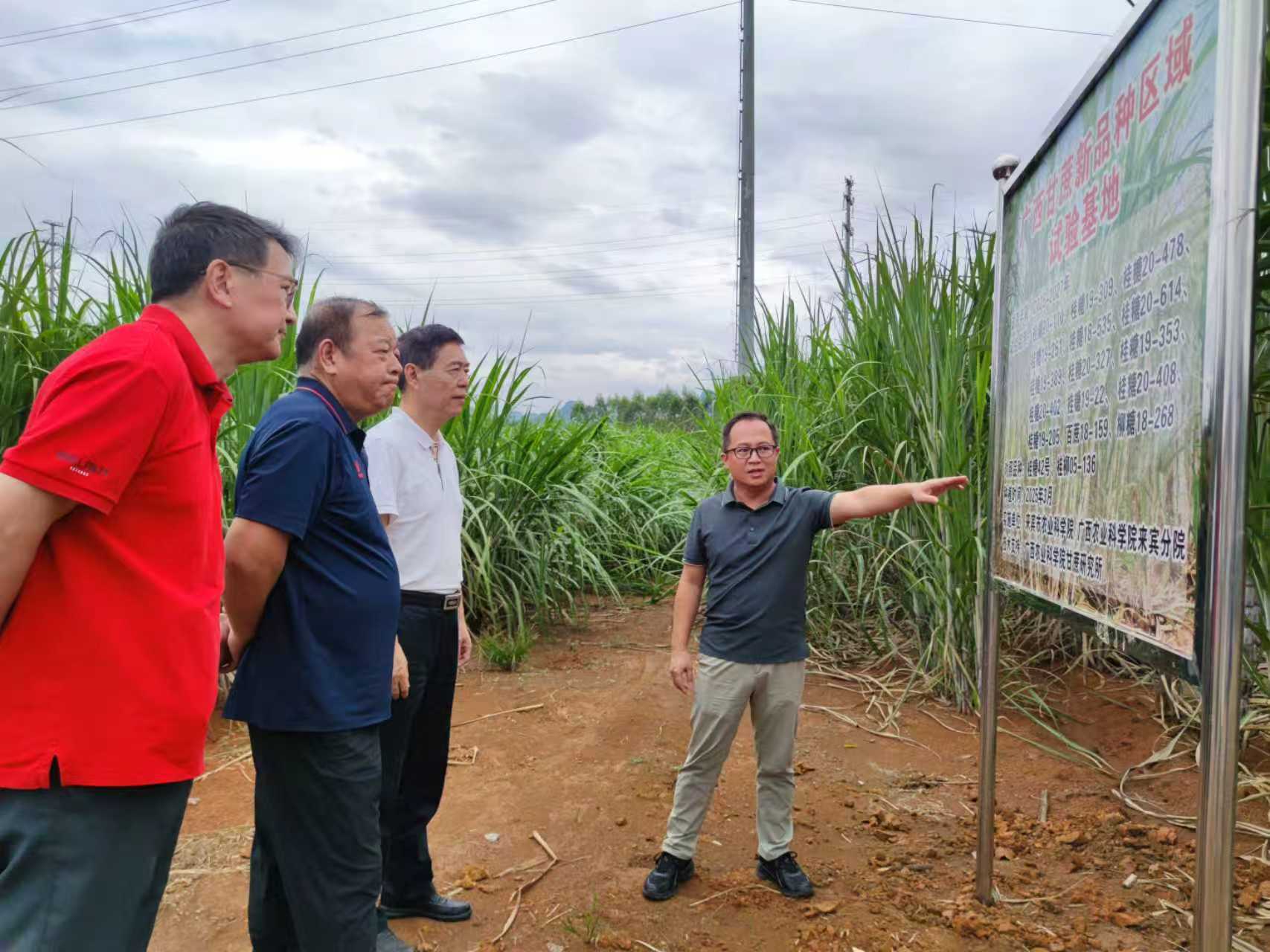 钱健理事长一行深入田间地头,实地考察了试验基地的总体规划、科研布局以及利用物联网技术进行甘蔗长势智能监测与管理的智慧农业实践。在甘蔗产业示范基地,调研团队详细观摩了由来宾市农科院自主选育的“来糖品系”、与广东省科学院南繁种业研究所联合选育的“粤桂来糖”等高产高糖新品系的长势,并认真听取了科研人员关于甘蔗优良新品种展示、水肥一体化精准栽培、病虫害绿色综合防控、智能化管理与监测等关键技术的汇报。