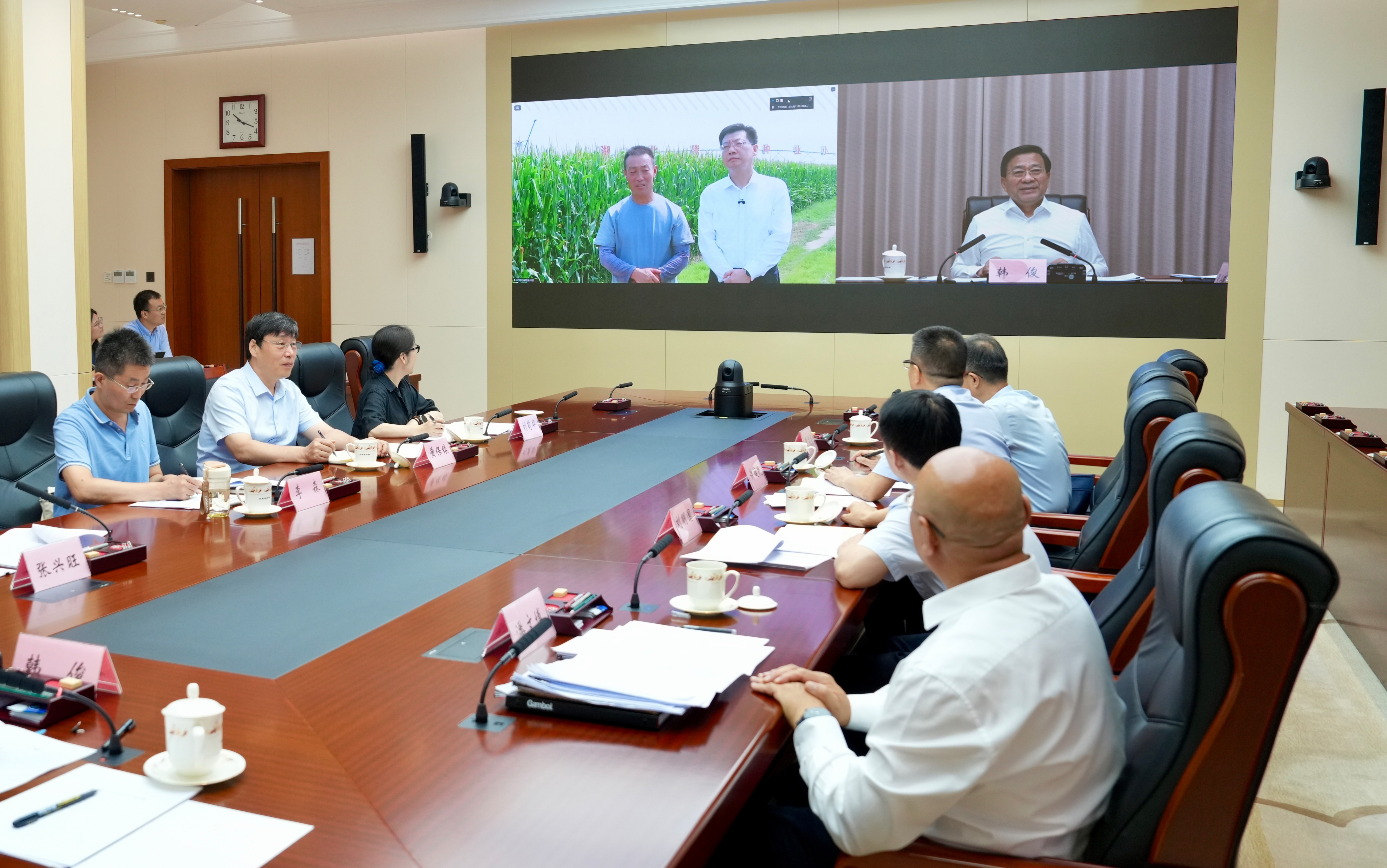 会议视频连线安徽省宿州市灵璧县、湖北省襄阳市襄州区、河南省周口市、内蒙古自治区巴彦淖尔市等地秋粮生产现场,了解防灾减灾救灾情况和秋粮长势。韩俊与有关负责同志、种粮大户、家庭农场负责人等连线交流,询问灾情影响、抗旱浇水、排涝减渍、改种补种、保险理赔等情况。他指出,入汛以来,我国气象条件总体偏差,华东华北等地持续遭遇强降雨,黄淮等地持续高温干旱,对农业生产带来不利影响。各地全力抗旱浇灌、抢排积水,有效降低了灾害影响。现在距秋粮大面积收获还有2个月,正是作物生长发育关键期,也是气象灾害多发频发期,区域性、阶段性旱涝灾害明显,农业防灾减灾形势依然严峻。要把农业防汛抗旱救灾作为当前农业农村系统的压倒性任务,做到“防在成灾前、抗在第一时、救在第一线”,力争重灾区少减产、轻灾区保稳产、无灾区多增产,全力以赴夺取秋粮丰收,努力实现全年粮食生产目标任务。