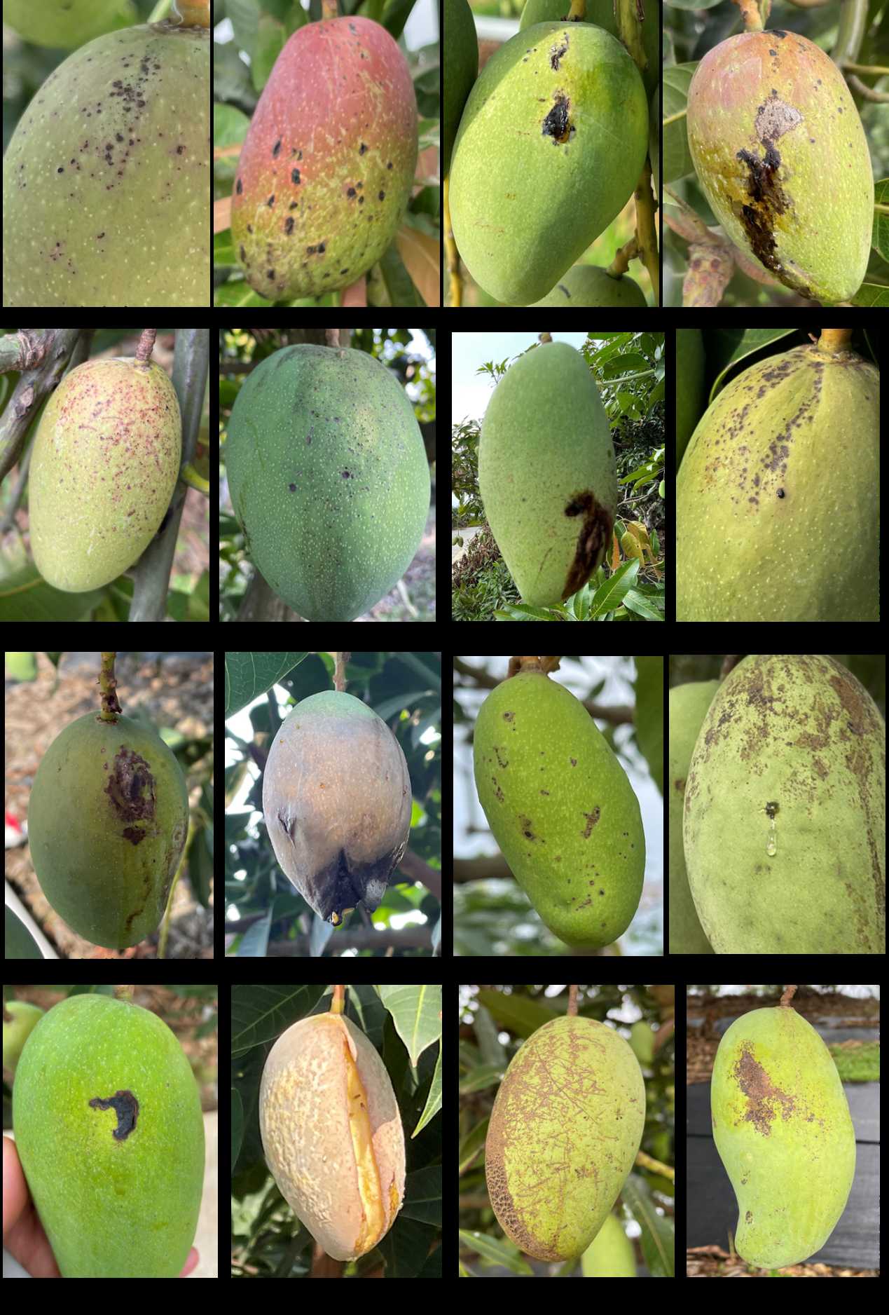 从调查情况看,大部分果园的台农1号芒无胚果预计在6月20号左右可以采收。由于今年春季干旱时间较长,在一定程度上抑制了病虫害的发展。加上果农管理水平提高和用药及时,多数果园的病虫害指数较低。值得一提的是,田东县平马镇小龙村芒果示范基地的迎风坡地芒果园,多年来芒果细菌性角斑病发生严重。今年,芒果栽培与病虫害防治岗位与田东县农业农村局合作开展的绿色防控用药试验,防控效果良好,病果率不到0.5%。但是,此次调研也发现,有部分果园清园力度不够,后期管理粗放,病虫害指数高,果面病虫斑较多。果体病害主要是红点病、花粉头(鳄皮果)、炭疽病等,虫害主要有蓟马、果实蝇、瘿蚊等。
