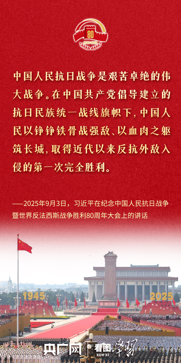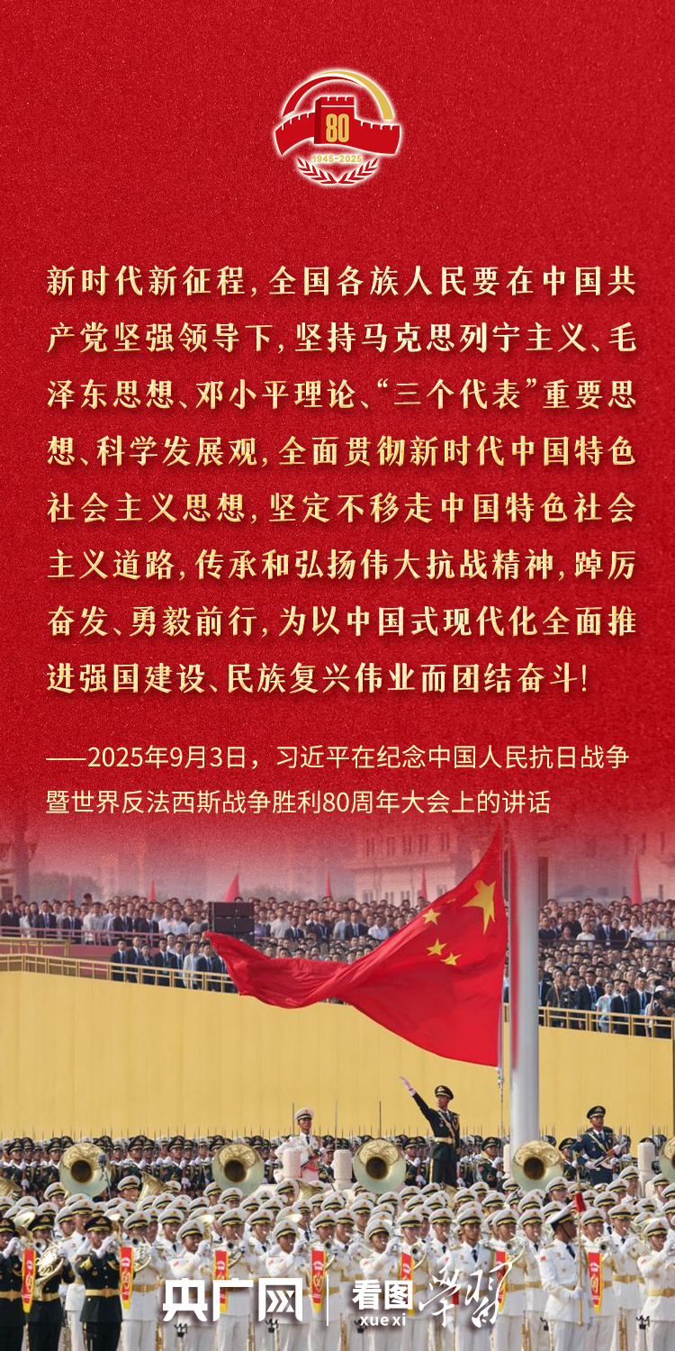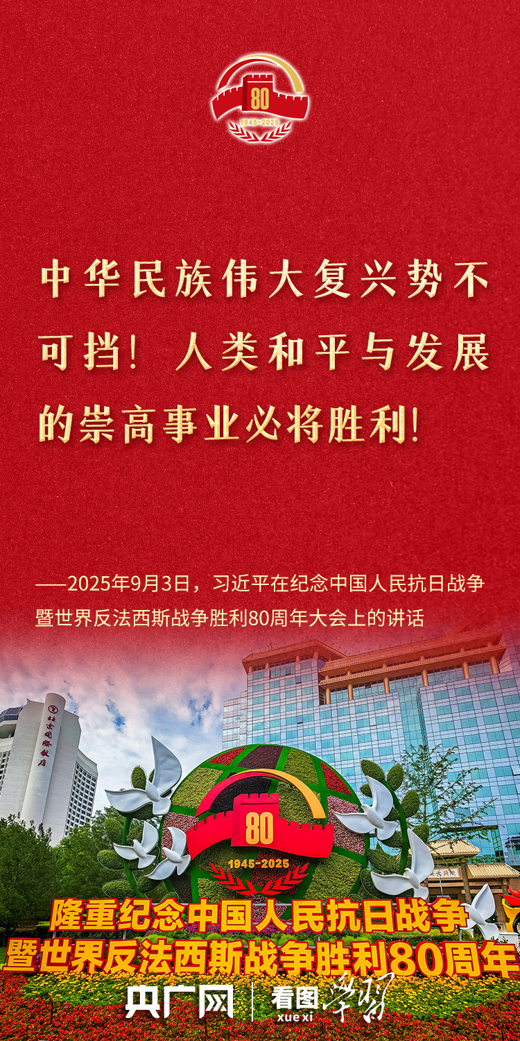 2025年9月3日,纪念中国人民抗日战争暨世界反法西斯战争胜利80周年大会在京隆重举行,中共中央总书记、国家主席、中央军委主席习近平发表重要讲话并检阅部队。习近平总书记在讲话中深刻阐释中国人民抗日战争胜利的重要意义,深刻揭示了这一伟大胜利对实现民族复兴伟业的深远启示,号召全国各族人民要在中国共产党坚强领导下,“坚定不移走中国特色社会主义道路,传承和弘扬伟大抗战精神,踔厉奋发、勇毅前行,为以中国式现代化全面推进强国建设、民族复兴伟业而团结奋斗!”
